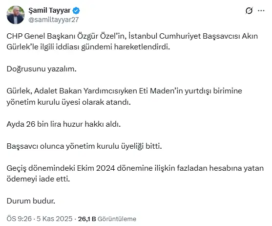 ‘Yandaş’ isimler Akın Gürlek’i savunan paylaşımlar yapmaya başladı. Ancak, Özel’in açıkladığı belgelerde Akın Gürlek’in söz konusu şirkette, başsavcı olarak atandıktan sonra da yönetim kurulu üyesi olarak devam ettiğini gösteriyor.